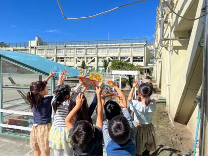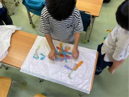 2年生が図工で、お花紙を買ったり、重ねたりして思い思いの形を作っていました。作品を明るい所でかざすと透き通って、とてもきれいに見えました。教室では見えなかったよさに気付くことができたようです。
