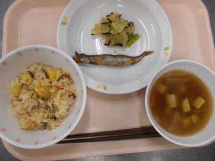 秋の香りごはん ししゃものからあげ キャベツの塩昆布あえ