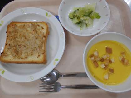 ツナポテトースト かぼちゃのポタージュ フレンチサラダ 牛乳