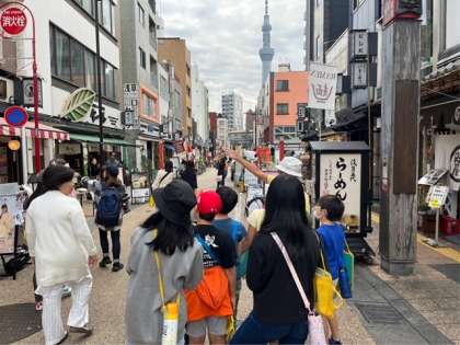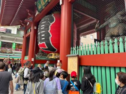 浅草に到着しました。ガイドの方に説明してもらい巡っています。貴重な体験です。外国の方もたくさんいます。たくさんの人を惹きつける浅草の魅力は何でしょう?探れるといいですね。