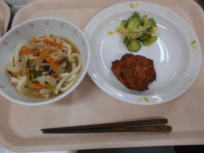 あんかけうどん 手作りさつまあげ キャベツときゅうりのごま風味