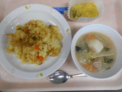 カレーピラフ ベーコンと白菜のスープ スイートポテト 牛乳