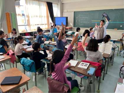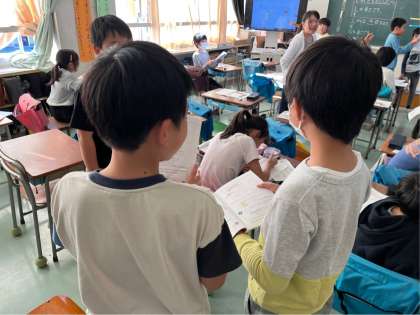 3年生は算数で分数を学習しています。1メートルを等分して分数を考え、どの分数が正しいかを友達と教え合いました。