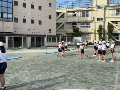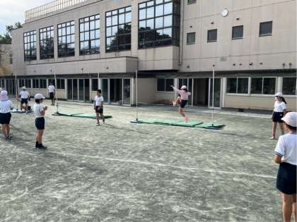 5年生が体育で走り高跳びに取り組んでいます。「1、2、3!」と声をかけ、走ってきた力で、上に高く跳べるようにイメージしています。一人一人が自分の記録を伸ばすために、課題を見つけて練習を進めていきます。友達とも教え合いながら、少しでも記録が伸びたらうれしいですね。もちろん、記録が伸びなくても、課題が見つかることや克服するために取り組むこともすばらしいですね。