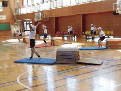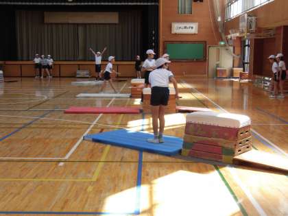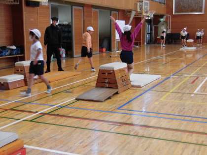 5年生の体育では、跳び箱運動の学習をしています。今日は「ピタッと着地してとまるコツ」について学習し、実践しました。足を広げすぎないこと、踏み切りで止まらないこと、勢いをつけすぎないこと、着地の時に膝を曲げることなど、ピタッととまるコツについて意見を出し合いました。徐々にコツをつかみ、大きくきれいに跳び箱を跳ぶ様子がたくさん見られました。最後のポーズもしっかり決まっていました。