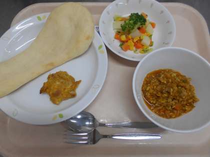 ナン 大豆入りキーマカレー マセドアンサラダ タンドリーチキン 牛乳
