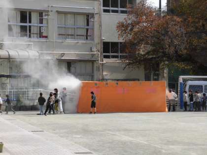避難訓練終了後、3年生は煙体験を行い、火事が発生した時の煙の怖さを疑似体験しました。煙を吸わないように、ハンカチなどで鼻と口を押さえ、低い姿勢で避難することが大切であることを学び、日頃から避難経路や非常口を確認しておくこと必要であることがわかりました。