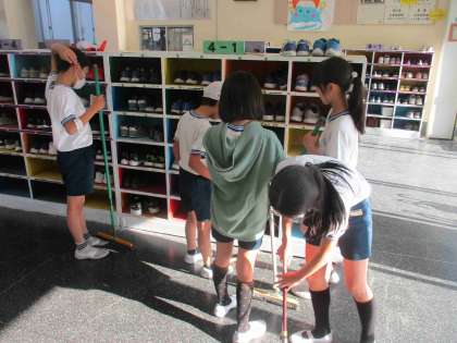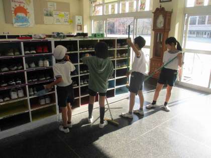 4年生が掃除の時間に下駄箱を掃除していました。外靴を出し、ほうきで砂やごみをかき出して、ちりとりで集めています。丁寧に、一所懸命に取り組む姿に感心しました。