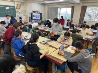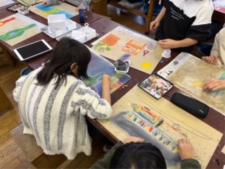 5年生が図工でコンテを使って絵を描いています。黄ボール紙に、コンテで描くことで、色が重なったり、指や手、綿棒などを使い分けたりすることで、色が混じったりぼやけたりします。ビンに写る影や色のついたグラスに入っている様子にこだわって描く子もいました。みんな真剣に取り組んでいます。