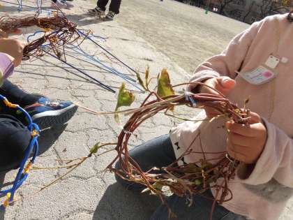 日中は日差しの暖かさが感じられました。校庭では1年生がリース作りを始めました。