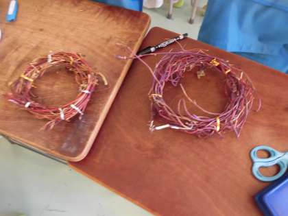 小学校に入学して初めて育てた朝顔のつるを使います。支柱に絡みついた長いつるを、なるべく切らないようにはずします。硬そうに見えましたが、みんな上手に丸い形を作っていました。少し葉の残っているものもあり、よいアクセントになっていました。好きな太さ、大きさに形を整えるところまで今日は作業をしました。次回は毛糸やモール、ビーズなどを持ってきて、華やかに飾りつけをします。