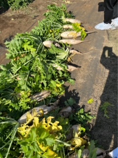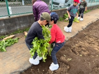 大きな大根がたくさん抜けました。高学年の子が低学年の子の手伝いをして、頼もしいです。
