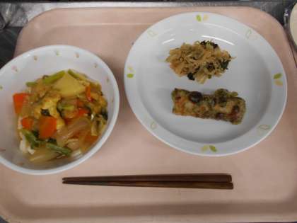 カレーうどん じゃこサラダ ちくわの磯辺揚げ 牛乳