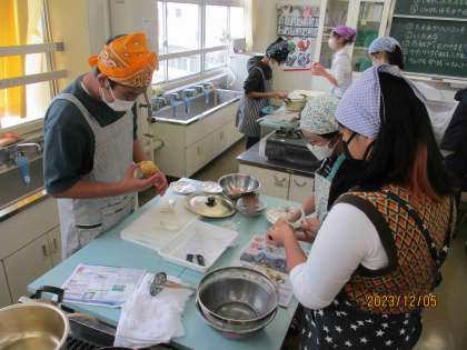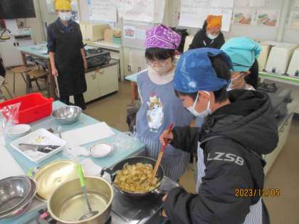 6年生が家庭科で調理実習をしました。作った料理は「ベーコンポテト」です。班で協力して、ジャガイモを洗い、玉ねぎを切り、ベーコンとともに炒め…という工程を進めました。出来上りが近づくと廊下にもいいにおいが漂い、その後、「おいしいよ!」という子どもたちのうれしそうな声が聞かれました。私にもお裾分けをくれ、食べるととてもおいしかったです。ぜひ、お家でも作ってもらってみてください。