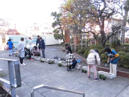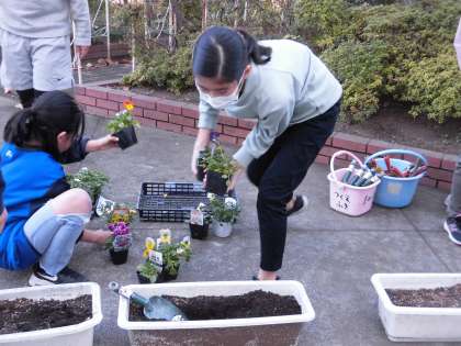 運動委員会では運動用具の整備や確認したり、栽培委員会ではプランターにパンジーなどの花を植えて玄関前に設置しました。各委員会のメンバーが学校を明るくにぎやかに盛り上げてくれています。