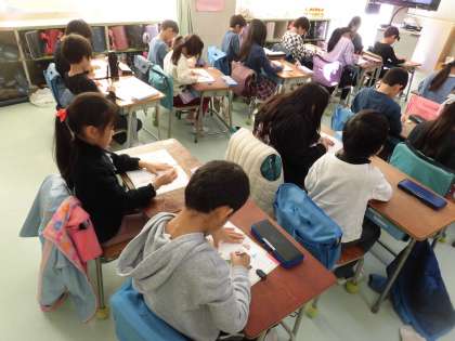 「練習スタート。」の声がかかると、全員がぴんと背筋を伸ばし真剣に書き始めました。にぎやかだった教室が、しんと静まり返りました。