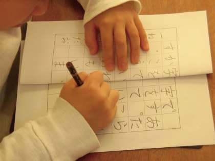 1年4組では、今日初めて書写の学習に取り組みました。まず、よい字を書くために大切なことを考えました。姿勢をよくすること、鉛筆を正しく持つことに気をつけます。