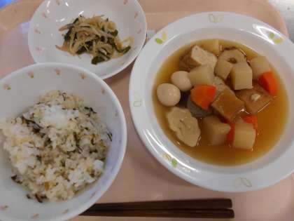 菜飯 おでん もやしとわかめの和風サラダ 牛乳