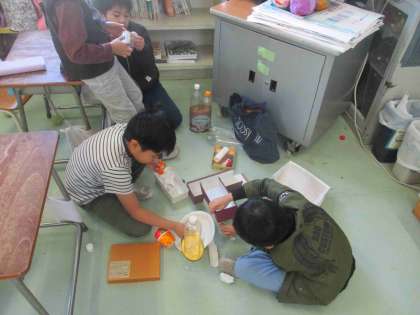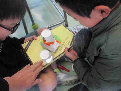 2年生が生活科でペットボトルやお菓子の箱、紙コップ、ストローなどを使っておもちゃを作っています。ウサギの人形やロボット、風車など、ワクワクするおもちゃがいっぱいです。中でも、磁石を使って動かす「お相撲ゲーム」には感心しました。友達と見せ合ったり、一緒に遊んだりと楽しそうです。友達と活動することで、新しい発見にもつながるようです。