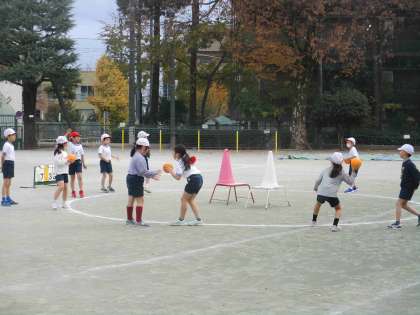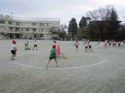 2年生が体育でボールを使ったゲーム運動をしています。チームに分かれ、円の中心の的に、決められた時間の中で何回当たるかを競っていました。しっかり狙わないとならないですが、あまり時間をかけると投げる回数が減ってしまいます。友達と声を掛け合いながら楽しそうに取り組んでいました。週末の暖かさから急に寒くなりましたが、子どもたちは元気一杯で活動していました。