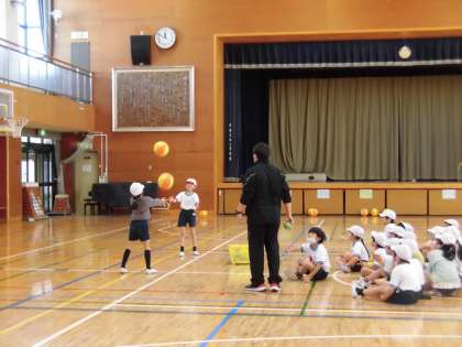 今日のめあては、ボールを使ってもっとにこにこになる遊びの仕方に挑戦しようです。もとになる動きは1投げてキャッチ2ドリブル3ころがすの3つにしました。123それぞれで、まずは回数を多くできるように練習しました。どうやって早く正確にドリブルするか、友達と向かい合ってボールを投げ合い何回キャッチできるか、いろいろな方法を試してみていました。次に向きを変えてできるか挑戦しました。後ろに進みながらドリブルをしたり、高く投げたボールを背面キャッチできるかなどみんな難しい技に取り組んでいました。