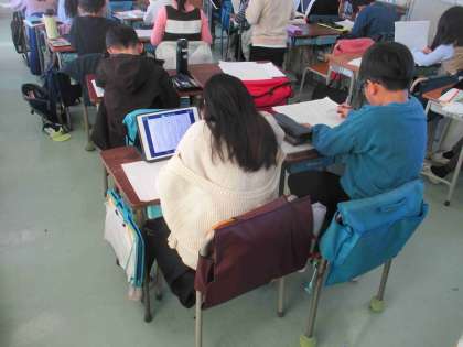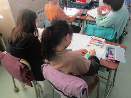 3年生が国語で、自分の考えた物語を書いています。教科書にある「たから島の ぼうけん」を通して、物語の書き方を学習しました。下書きをして清書したり、表紙を描いたりしています。世界で一つだけの物語です。どんな物語ができあがるのでしょう。楽しみです。
