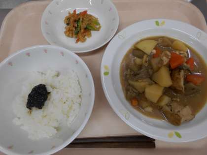 ごはん のりのつくだ煮 五目うま煮 野菜のごま和え 牛乳