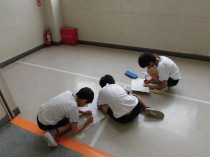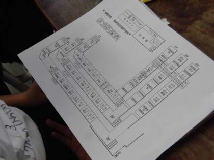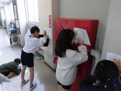 はじめに、学校にある防火設備を書き出しました。消火器、火災報知器、煙感知器、防火シャッター、スプリンクラー、脱出シューターと、たくさん挙がりました。今日はそれらの設備が、学校のどこにあるのかを探しに行くことになりました。校内案内図を見ながら、見つけたものを書き込んでいきます。より深い学びにつなげるために、気付いたことや発見したことのメモも加えます。教室から出発した子どもたちの持つ案内図は、マークや書き込みでたちまち埋められていきました。今日の調査をもとに、次回はどうしてそれがその場所にあるのかを考え、発表しあいます。