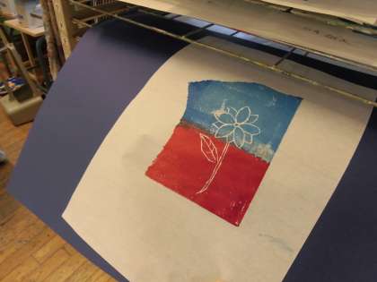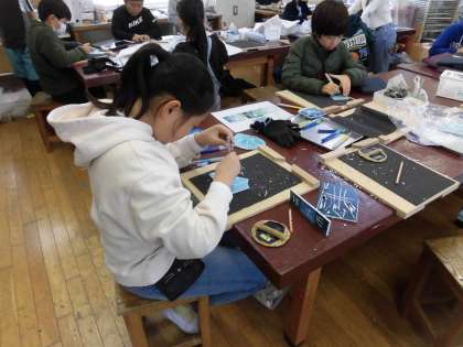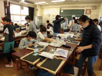5年生の図工では「変な板版画」の制作に取り組んでいます。事前にカットしたいろいろな形の板を見えないようにした箱に入れて、その中から「運命の板!」を選びます。選んだ板の形を見て、ひらめいた模様や絵を彫刻刀で彫り描いていきます。彫刻刀の持ち方や安全な使い方を再度確認して、平刀、丸刀、三角刀などを上手に使いこなして模様を描いていました。版が出来上がったら、ローラーでインクで塗って紙に刷りました。同じ版にインクの色や向きや位置を変えて刷って模様を浮かび上がらせた「かわいい花」の版画など、すてきな作品がたくさん仕上がりました。木端材を活用した作品の制作はSDGsの取組の一環となりました。