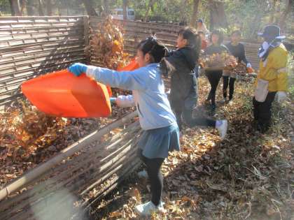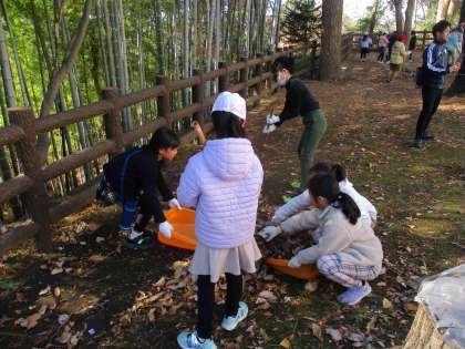 3年生が里山で落ち葉かきをしました。世田谷トラストまちづくりの方々に、集めた落ち葉をためて、栄養がたくさんの土に戻すことや、落ち葉をためているところは、カブトムシの幼虫などのいろいろな生き物の住みかになることを教えてもらいました。みんなで力を合わせてたくさんの落ち葉を集めました。落ち葉はどのように土になるのでしょう。また観察してみましょうね。