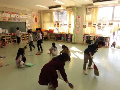 各学年で、大掃除を行いました。学期の終わりの恒例行事ですが、前回に比べると要領よく進めることができるようになり、さらに丁寧さにも磨きがかかっていました。机やいす、大きなテレビもすべて廊下に運び出した教室は広々とします。その分普段は気づかない汚れがたくさんあります。床にこびりついた汚れの1つ1つをこすって落としたり、雑巾がけも、友達と並んですきまがあかないようにしっかりかけたりしていました。