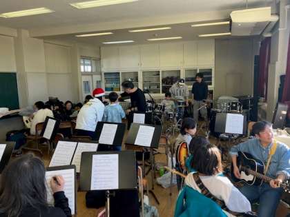 明正小学校のOBで編成されているMMCBによるワークショップは楽器体験です。キーボード、ギター、ベースギター、ドラムなどの楽器演奏とボーカル体験を「サンタが街にやってくる」「あいのしるし」の曲で行いました。初めての楽器体験をする子も多くいましたが、子供は覚えるのが早く、みんなで合わせる時には見事な演奏を披露していました。