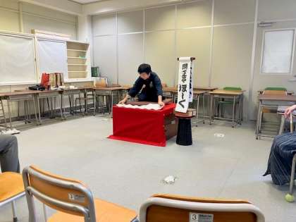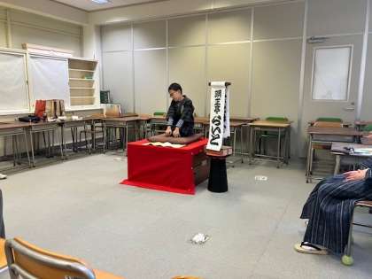 そして落語体験の様子です。今日は2名の児童が体験しました。短時間で、名前を決め、自己紹介を決め、短いネタを覚え、小話を覚えと大忙しの内容でしたが、最後の寄席本番では観客もいる中で、しっかりと練習の成果を披露しました。表現力が短時間で大きく成長しており、見ごたえのある寄席となりました。