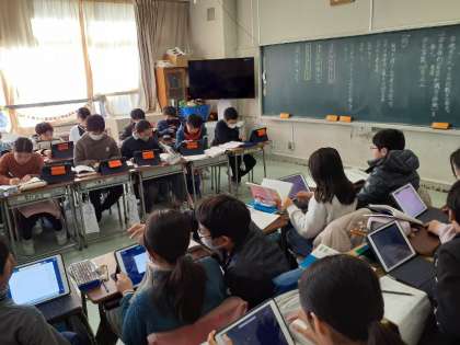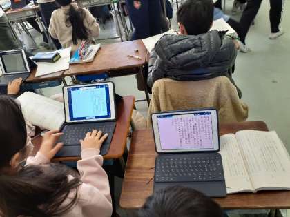 5年生の国語の様子です。「想像力のスイッチを入れよう」という説明文の学習です。情報への接し方において重要な四つの「想像力」について書かれています。「まだはっきり分からない」「事実かな?印象かな?」「他の見方もないかな?」「かくれていることはないかな?」という想像力を働かせて情報に接することの重要性の中から、今の自分にとって重要な想像力を決め、意見文を書くことに挑戦しました。具体例を入れたり、他の想像力と比較したりして説得力のある意見文にしようと頑張っていました。「まだはっきりと分からない」という想像力を重要視している児童がたくさんいました。国語の書く力だけでなく、情報リテラシーについても学べる、よい学習をしていました。