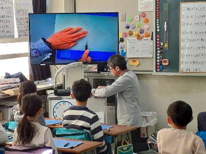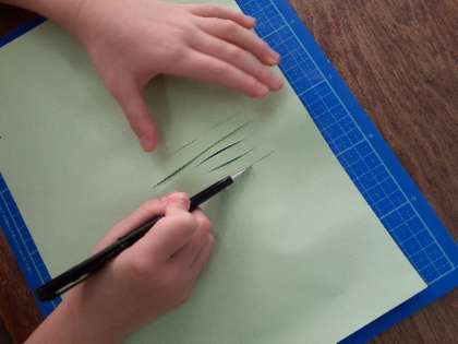 2年生の図工では、カッターの使い方を学びました。めあては、「めざせ!カッターナイフ名人」です。はじめに、カッターナイフの使い方、ルールを知りました。カッターナイフの持ち方や切り方を大型テレビに映し、先生のお手本を見ました。次に、実際に、紙をカッターナイフで切りました。はじめは、恐々と切っていたのですが、段々とギザギザの線やカーブを上手に切ることができるようになりました。「カッターナイフ名人」になれたのではないでしょうか。