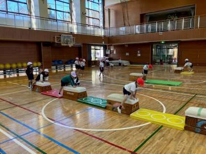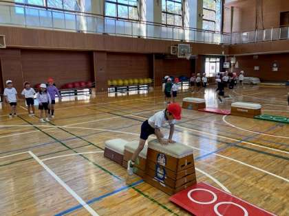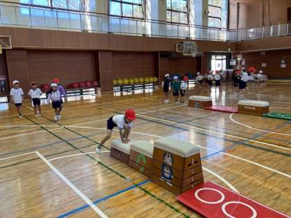 1年生の体育館体育では跳び箱を使った運動遊びをしています。跳び箱に跳び乗ってジャンプして着地を決めたり、跳び箱にまたがって手と腕で体を前に運んで進んだりしながら、楽しく遊んでいました。「ワニがいるんだよ」とジャングルを想定した場所で、水に落ちないように跳び箱に両手をついてその水場を跳び越える遊びはとても盛り上がっていました。楽しく遊びながら、跳び箱運動につながる動きを身に付けていました。
