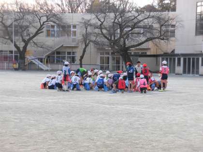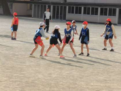 今日は、ルールをしっかりと理解し、チームに分かれてゲームを行いました。ボールを持っている人が前進できるよう、ボールを持っていない人がスペースをあけるといった全員の動きに注目しながら、相手をかわしながらボールを運びます。どのような作戦をたてると得点につながるのかなど、先生と一緒に振り返りながらゲームを行いました。全員がとても機敏な動きで、チーム力も向上し、協力して自分たちの作戦を実行しているようで、熱気あふれるゲームになりました。