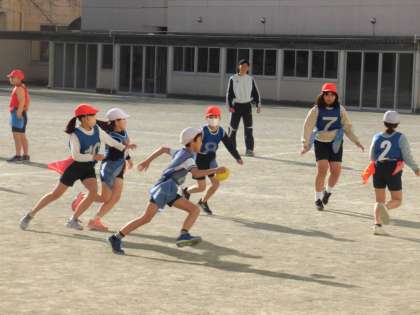 5年生の体育では「フラッグフットボール」を行っています。フラッグフットボールはアメリカンフットボールの特徴を残しつつ、安全にプレーできるようにタックルなどは行わず、腰につけた「フラッグ」をとります。