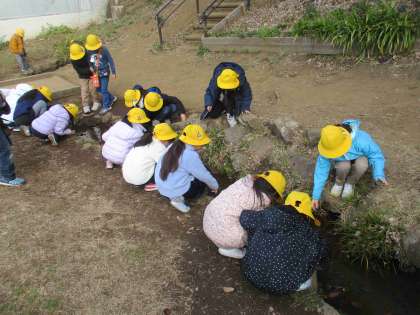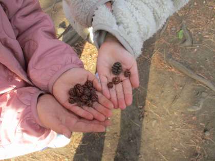 1年生が生活科で「冬」を見付けたり、遊んだりする活動をしています。里山に行って活動しました。どんなものが落ちているかじっくり探して、木の実や枯れた葉や花を見付けました。それらを並べて飾りを作っていました。暖かくなるように、鬼ごっこをしたり、せせらぎに落ち葉を浮かべて競争をしたりしていました。寒くても楽しそうです。子どもたちのいろいろなアイディアに感心しました。木の芽も少し膨らんでいるように感じました。