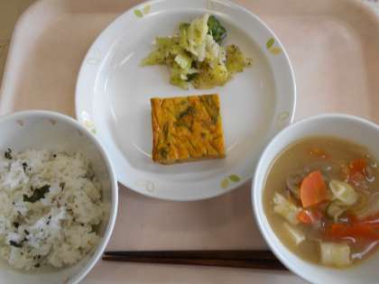 わかめごはん 卵焼き 野菜のゆかりあえ さつま汁 牛乳