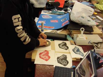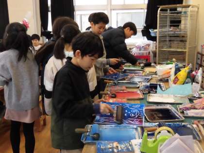 5年生の図工では、「変な板版画」の制作をしています。彫刻刀の安全な持ち方や使い方をしっかりと確認していろいろな形の板に、色々な模様を彫っていきました。版が出来上がったら、ローラーでインクをつけて、刷っていきます。同じ版でも色の重ね方の違いで、奥行きや作品の雰囲気にも変化が出て、とても素敵な作品に仕上がっていました。真剣な眼差しの中にも、楽しみながら制作に取り組む姿が見られました。
