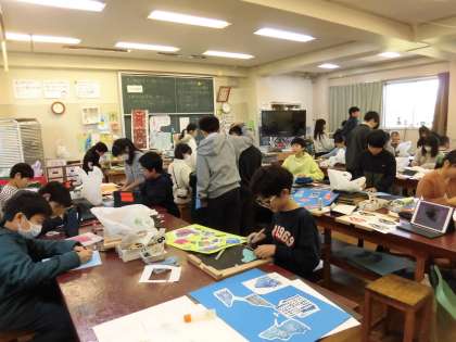 同時に、5年生は作品展に向けて「明正トーテムポール」の制作を進めています。お祝いの気持ちを込めて、どのような図案を考え制作を始めました。どんなトーテムポールが出来上がるのか、今から完成が楽しみです。