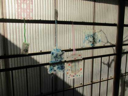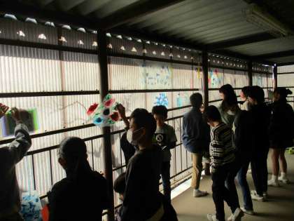 学習発表会に向けて、6年生が共同制作を進めています。実際に飾る場所に置いてみて、どんなふうに見えるか試してみました。日光に当てると、光が通り抜けたり、影ができたりと幻想的な風景が広がります。いろいろな色が透けて、とてもきれいです。本番では、たくさんの作品が飾られます。校舎がどのような風景になるのかとても楽しみです。