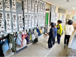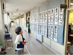 「書き初め展」が始まりました。自分の学年だけではなく、他の学年の作品もじっくり見ています。特に、高学年の作品を見ている時には、「すごいね」「上手だね」という声が聞こえてきます。