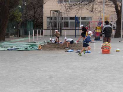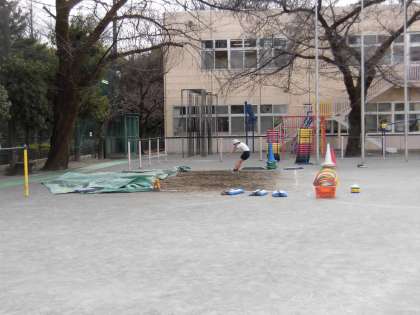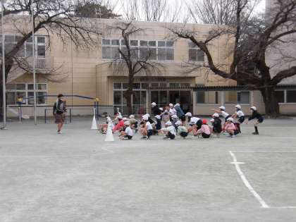 3年生の体育では「走り幅跳び」の学習をしています。走り幅跳びの基本を理解してから実際に挑戦しました。助走から踏み切って跳び、足だけでなく、腕も思い切り振り上げるようにすると遠くに跳べることも学習しました。「やった!さっきより遠くまで跳べた!」と何度も何度も練習することで、だんだんコツをつかんでいるようでした。とても寒い中での体育の学習ですが、寒さも忘れるほど真剣に取り組んでいました。