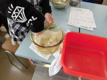5年生の家庭科にの調理実習で「炊飯実習」を行いました。先日たてた実習計画をもとに、グループで実習を行いました。お米量り、お米を研いで、分量の水を入れて30分吸水させてから火をつけました。ボタン一つでご飯が炊ける炊飯器を使うご家庭が多いですが、学校の炊飯実習では耐熱ガラス鍋を使用しました。鍋の中でお米からごはんに変化する様子もよく見ることができました。どのグループも、とても上手にごはんが炊けて、教室は良い香りでいっぱいになりました。「楽しい!」「めちゃくちゃおいしい!」と何度もおかわりする様子も見られました。片付けもテキパキと取り組むことができました。