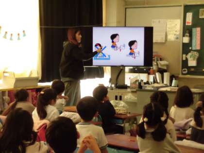 1年生には、学校でのトイレの使い方についてお話をしました。体から出るものは、自分の健康を知るための大切な手がかりであること、いちばん大切なのは、学校でがまんしないでトイレに行くことを伝えました。はじめは、「おしり」「うんち」の言葉がでるたびに笑い声が起こっていましたが、その大切さが分かるとみんな真剣に話を聞き始めました。トイレに生きやすい雰囲気をつくるには、どうしたらいいのか、いつもみんなが気持ちよくトイレを使うためには?などの問いかけに、一生懸命に答えていました。