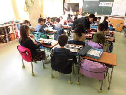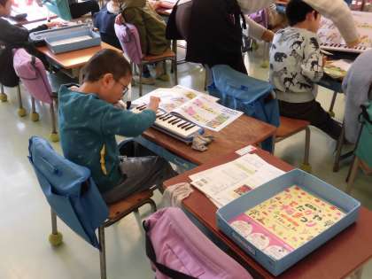 1年生の音楽では鍵盤ハーモニカの学習をしています。今日は「指くぐり」の練習をしました。指くぐりは、鍵盤ハーモニカの指づかいの一つで、ドレミから次の「ファ」の時にまた親指に戻る指の動きです。 まずは、音を出さないで鍵盤上で何度も繰り返し練習していました。最初はぎこちない指の動きの子もいましたが、一生懸命練習して「できた!」と喜ぶ声も聞こえました。きれいな音、なめらかな指づかいで「ドレミファソラシド」が弾けるようになりました。