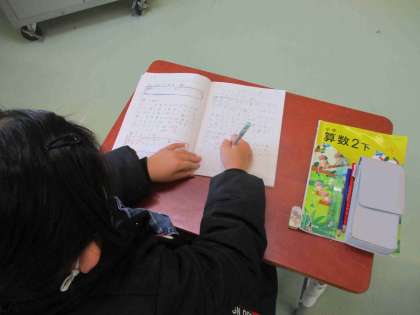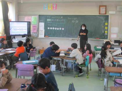 2年生は、算数で4桁の数字までの表し方や、何百の計算の仕方を学習しています。「何百+何百」は、どのように計算したらよいだろうと考え、ノートに書いていました。100円玉で考えたり、サクランボ算で表したりとアイディアが出ましたが、100のまとまりで考えると分かりやすいという結論になりました。自分の考えを近くの友達と紹介しあったり、全体に発表したりして学習を進めることができました。