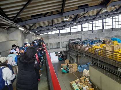日本一の青果市場を見学しました。すごい広さと段ボールの量。市場の中はほのかに柑橘系の香りがしました。ここから様々な地域の小売店に売られ、自分たちの地域のお店にもここから来た野菜、果物が並ぶという、流通の仕組みもよく理解することができました。